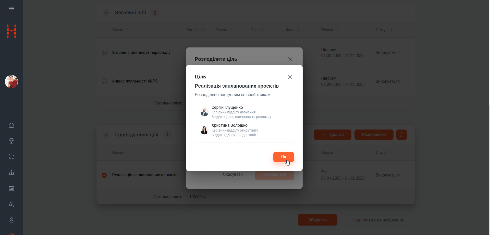 Крок 2. Ви обираєте відповідальних співробітників і розподіляєте на них індивідуальну ціль. Тобто тепер ваша ціль додається до переліку цілей обраних співробітників. Система перевірить, чи не створюється дублікат.