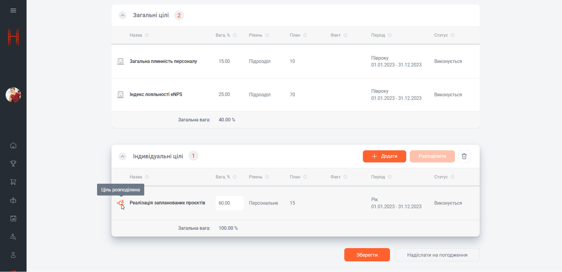 Крок 3. Вашій індивідуальній цілі додається відповідна іконка, яка свідчить про те, що ціль була декомпозована. За необхідності ви можете перейти на сторінку співробітника і змінити параметри цілі.