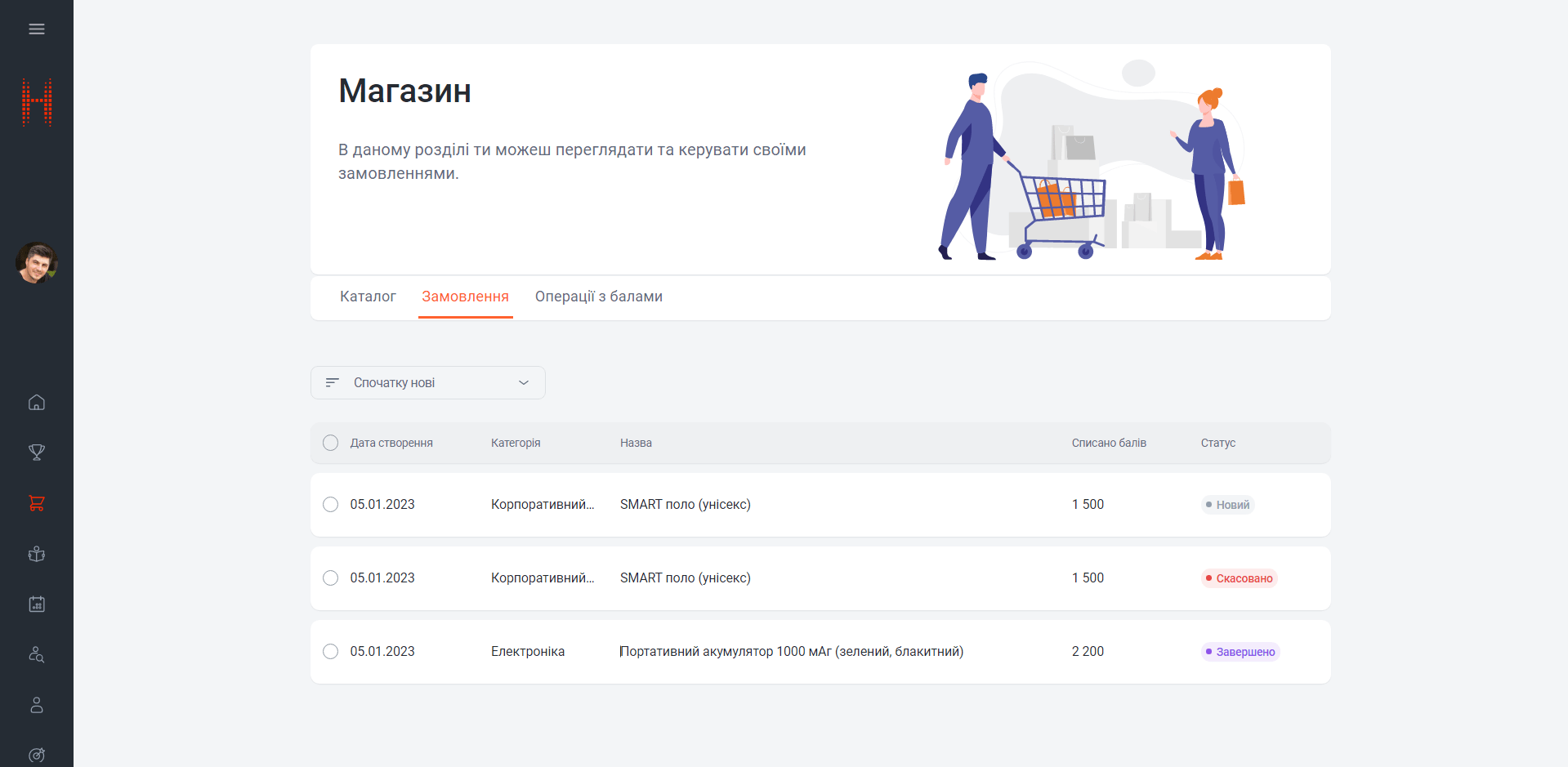 Сторінка магазину має три розділи: «Каталог», «Замовлення» та «Операції з балами». Далі детальніше про кожний.