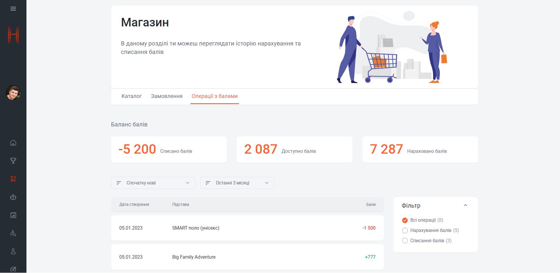 Ми створили калькулятор списання балів, який можна переглянути на сторінці «Операції з балами». Тут відображається баланс користувача: яка кількість балів була нарахована, списана та яка доступна до використання. Для зручного управління балами ми додали перелік усіх операцій з нарахування та списання, а також фільтри, які дуже спрощують пошук за операціями.