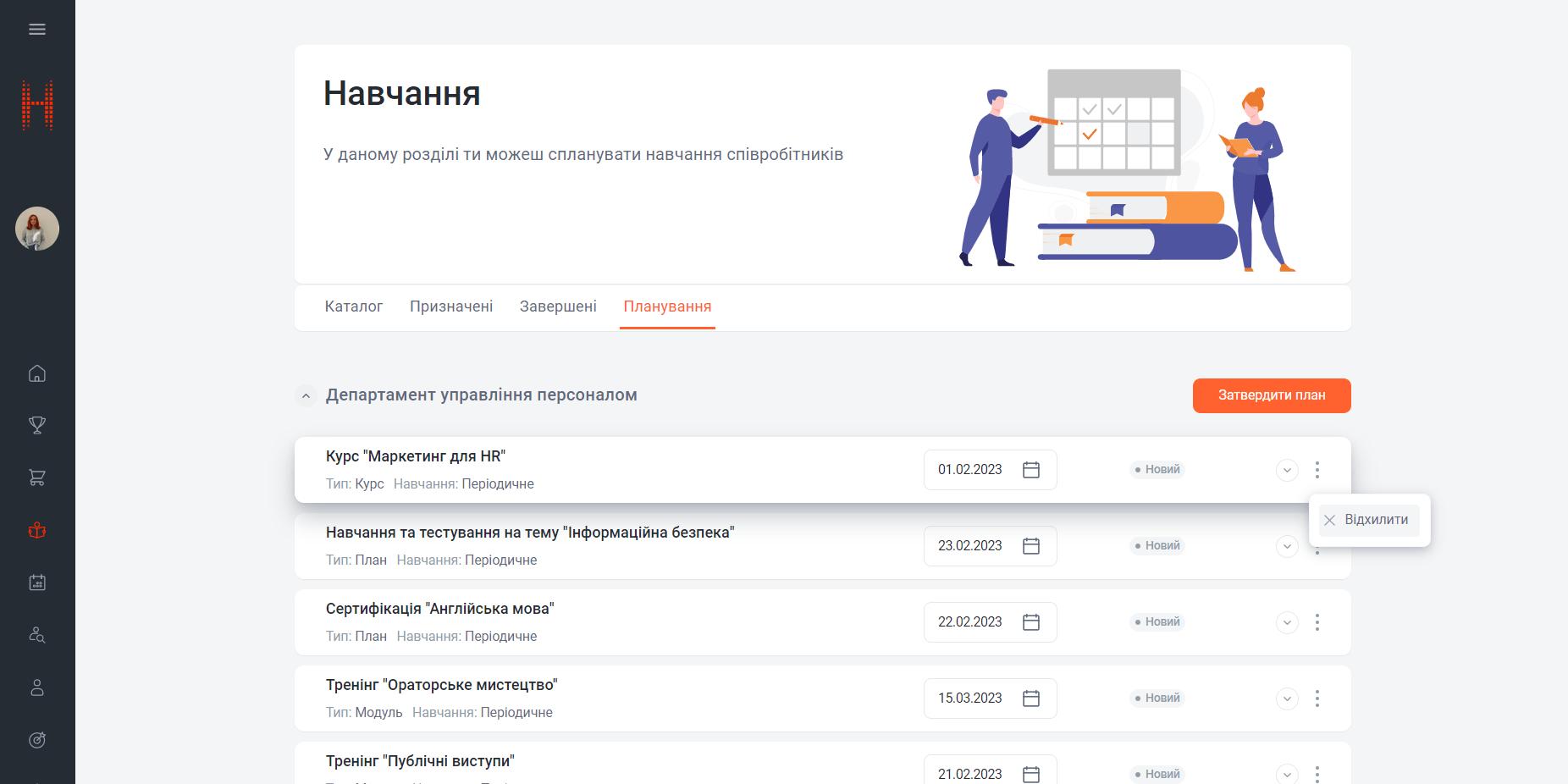 Також для керівників реалізовано функціонал відмови від запропонованого навчання, якщо воно було помилково внесено в базу HR-менеджером або є нерелевантним для його підрозділу та підлеглих.