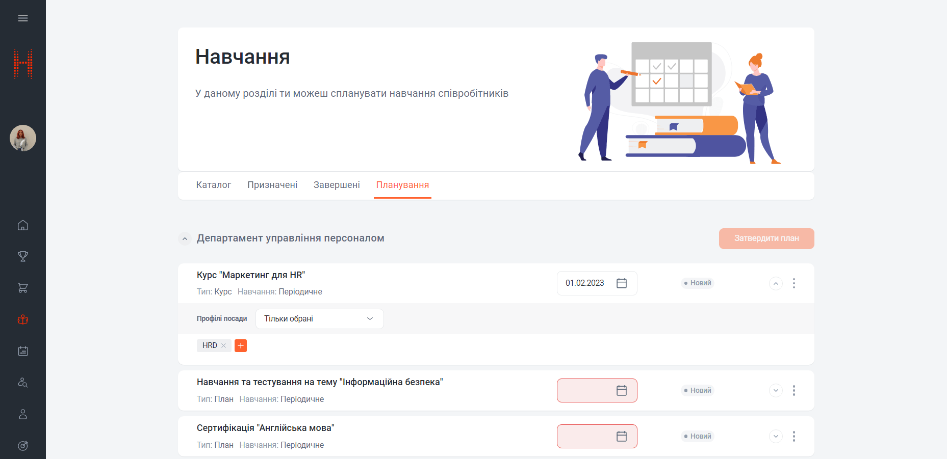 Таким чином модуль «e‑learning» набув нового функціоналу – «Планування навчання», за допомогою якого відбувається автоматизоване масове призначення навчання для великої кількості співробітників.