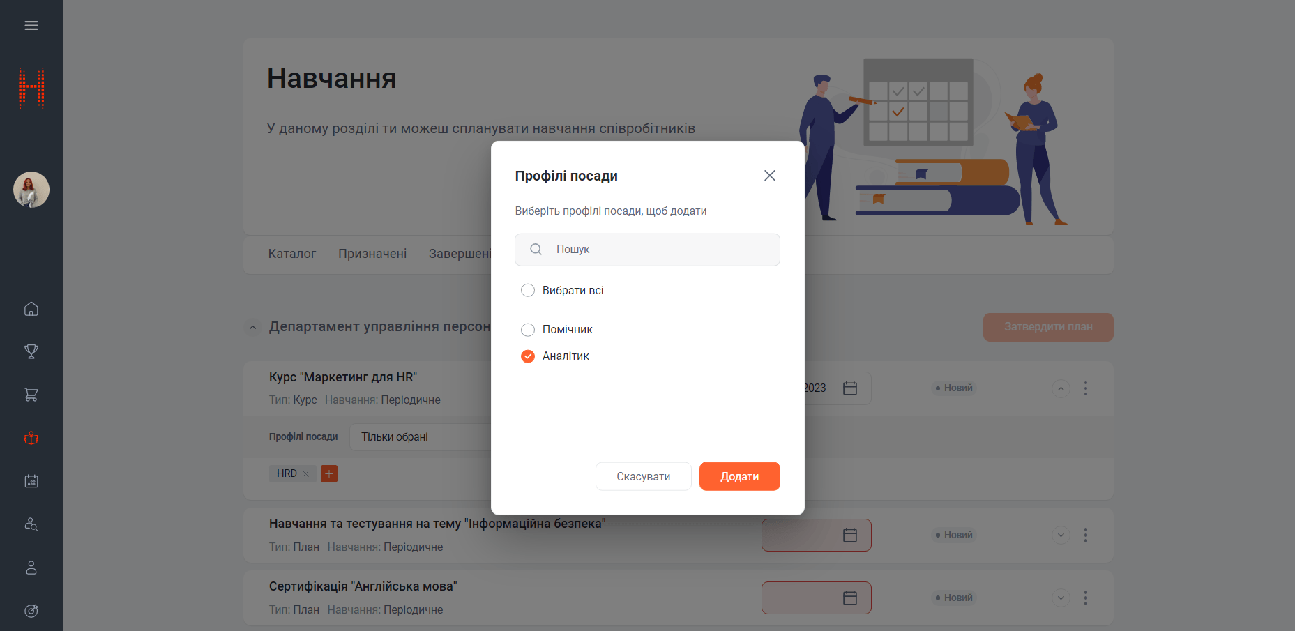 Планування навчання для розвитку певних навичок та компетенцій, що відповідають профілям посад, відбувається, за допомогою секції «Профілі посад».