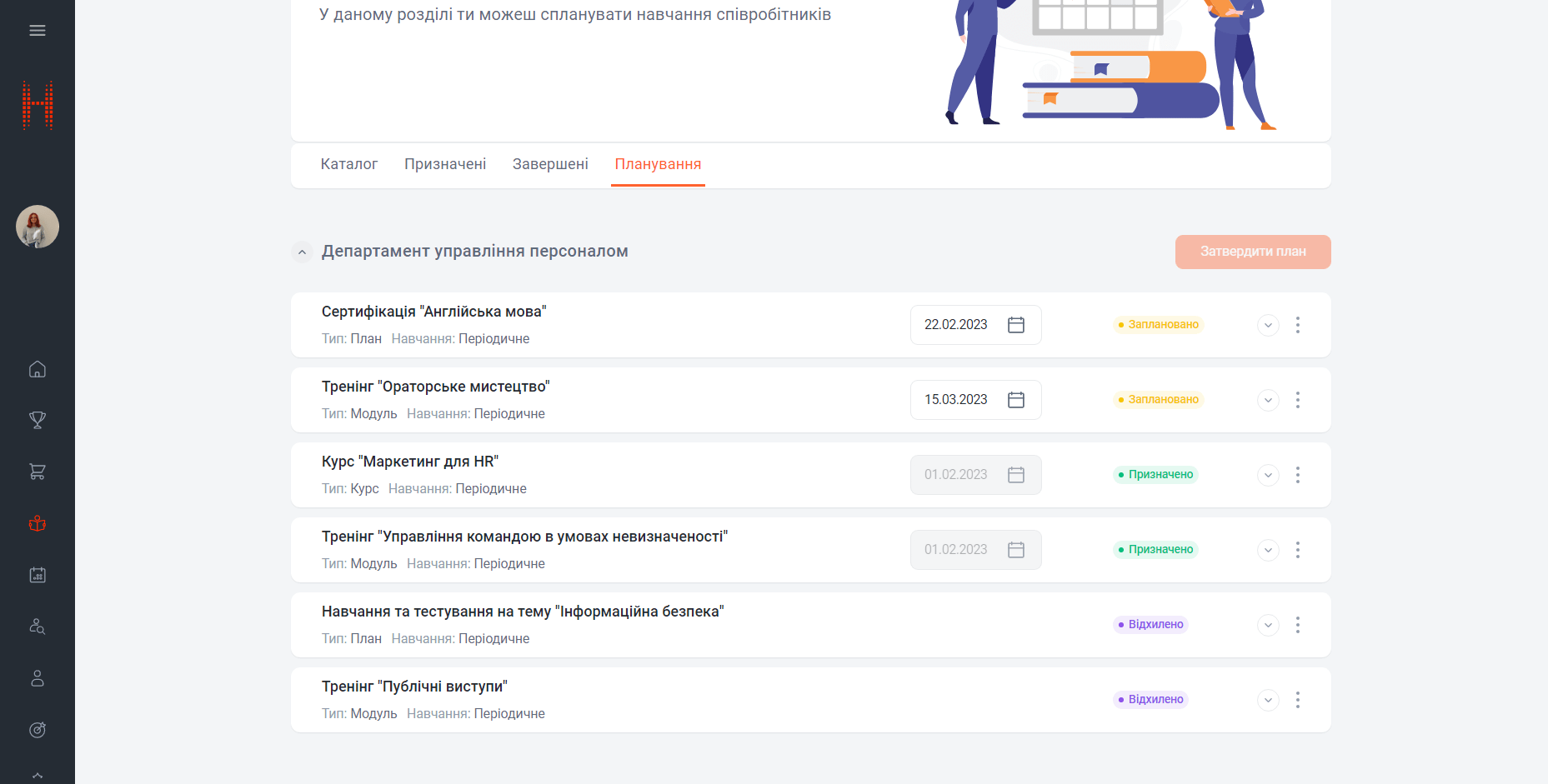 Щойно наступає запланована дата старту, план навчання переходить в статус «Призначено». Співробітник отримає сповіщення про початок навчання.