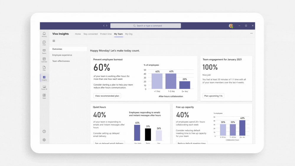 Managers can track information about personnel overload with appointments, insufficient time to focus, regular work outside office hours. All of these insights will inform management staff about the wellbeing of their team members.