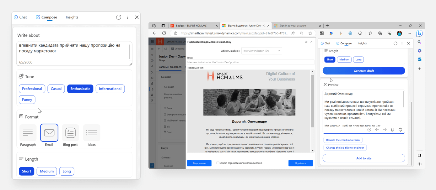 Наприклад, за допомогою бокової панелі чат-бота Bing АІ від Microsoft можна автоматизувати процес комунікації з кандидатом на всіх етапах взаємодії з ним, задаючи відповідні запити, що сформують готові офіційні чи приватні листи. В налаштуваннях ви можете вибрати тон спілкування, формат звернення для відповідного каналу комунікації та об’єм тексту.