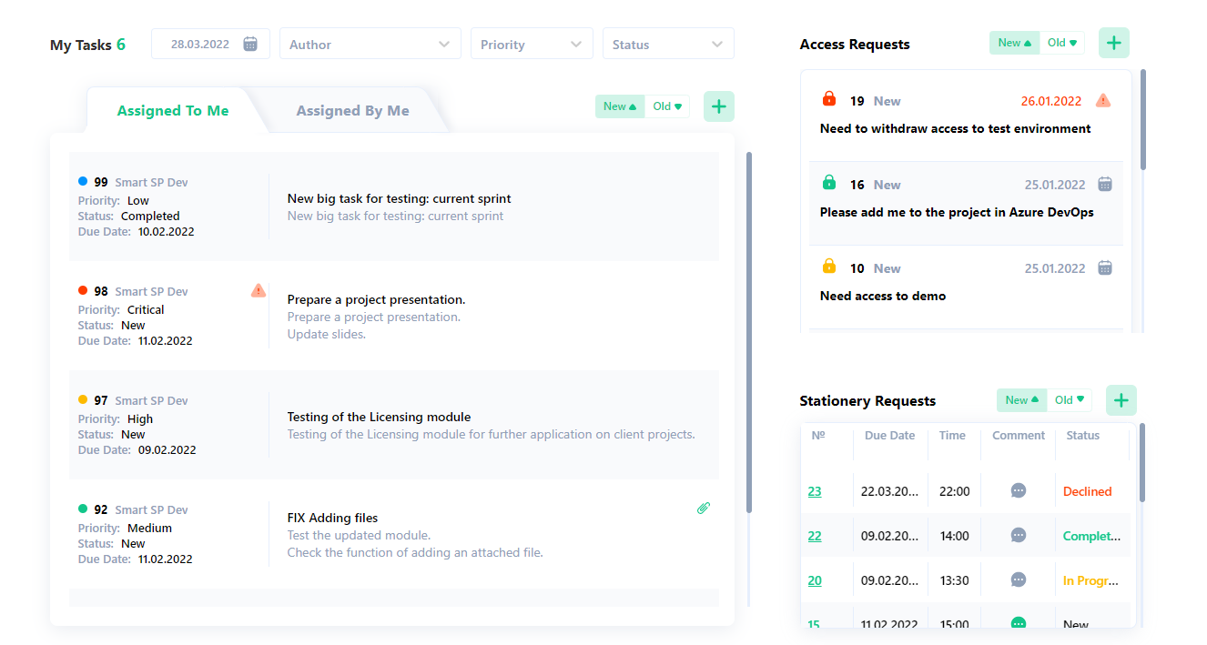 SmartPoint Intranet is a virtual employee collaboration environment developed using Microsoft technologies. That is, there’s no need to worry about the security of data storage on the portal, as the solution meets international standards. It is based on Microsoft SharePoint, Microsoft Teams and Microsoft Azure.