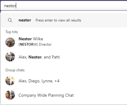 We are making it easier for you to search for and find the information you need by introducing “top hits” on Teams. This new section appears at the top of your auto-suggest results. Top hits gathers the most relevant results for you across the different search domains—people, group chats, teams, channels, and files—and reduces the need to scroll through all the search results, helping you quickly find what you need.