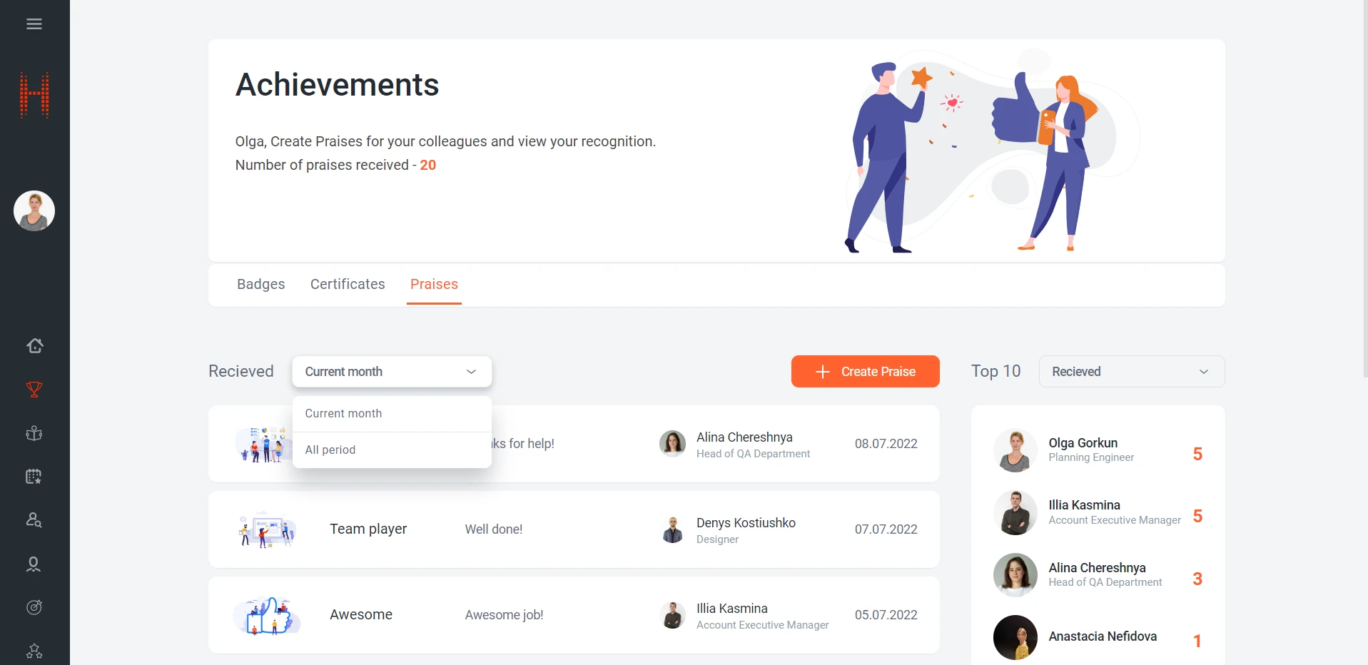 Users will be able to independently view the received praise, see their number by category, or thank a colleague by creating a new praise in the Achievements -> Praise tab.