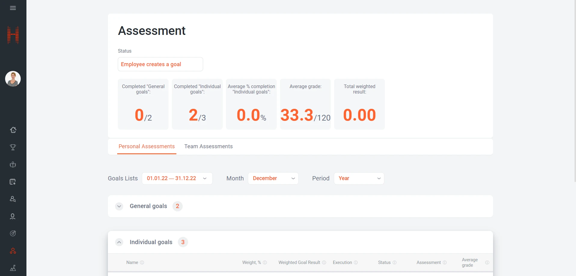 In the Personal Grades tab, an employee can see the general goals of the company, division, etc., and their individual goals assigned to them in accordance with the occupied position. This gives the employee an understanding of their importance in the global picture of business processes and how the achievement of their individual goals affects the achievement of the general goals of the company.