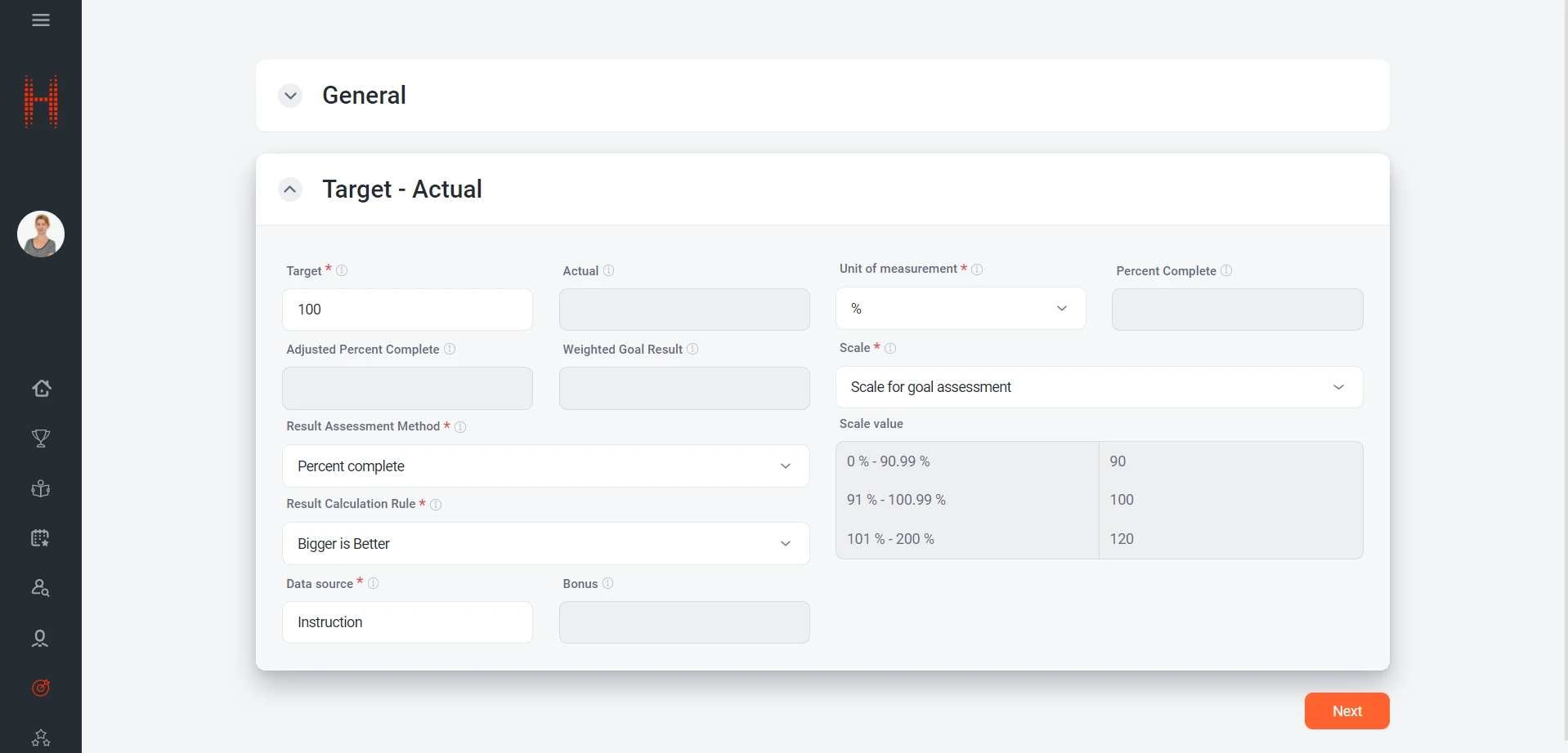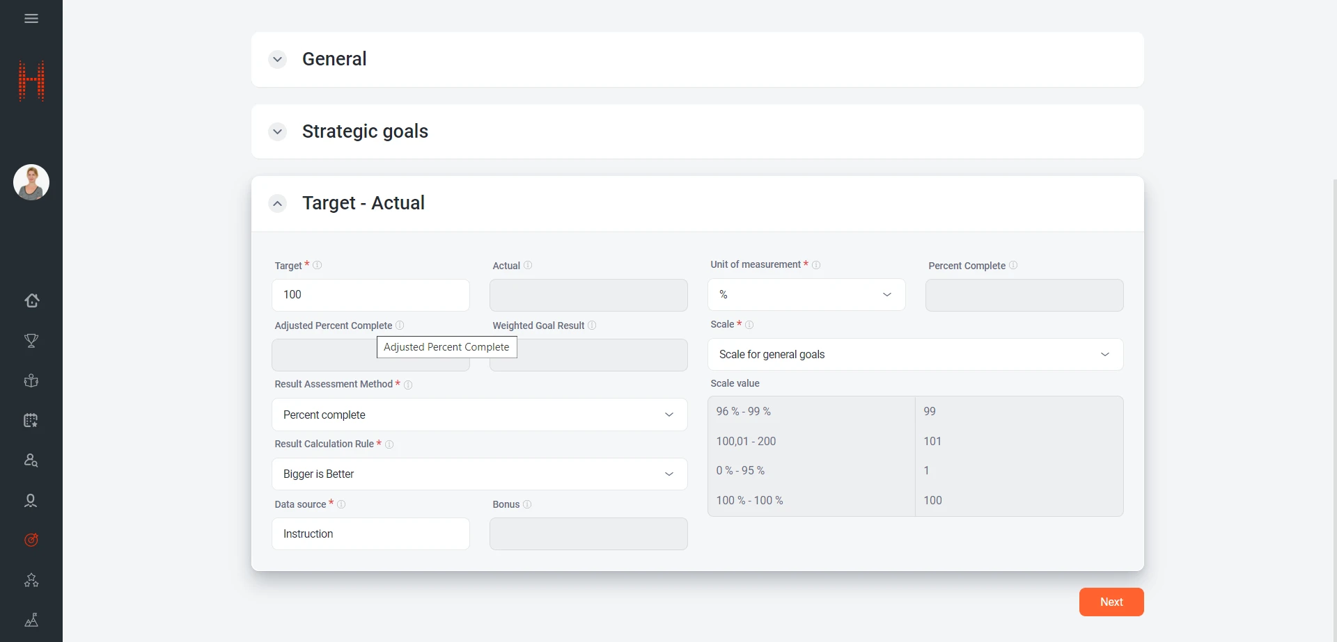 The value in the “Adjusted percentage of completion” field corresponds to the value obtained on the scale used to assess the goal and the weighted result calculation. The system automatically fills in the field with the scale value after calculating the “Weighted result”.