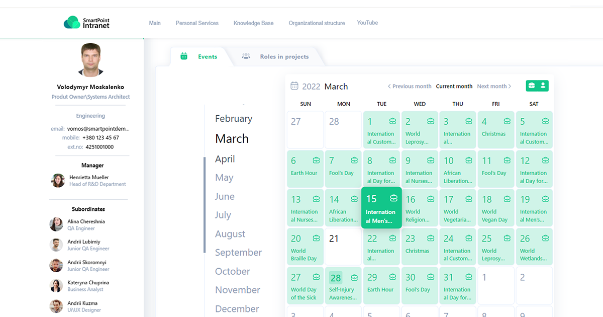 For example, such tools of the SmartPoint Intranet corporate portal as Personal Account and Personal Services make it possible for employees to: