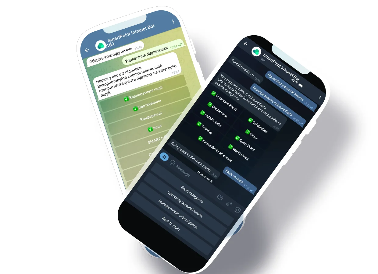 თქვენ ირჩევთ სიახლეების ან ღონისძიებების კატეგორიებს, რომელთა გამოწერაც გსურთ კორპორატიული პორტალის პარამეტრებში. ამის შემდეგ, თქვენ იწყებთ შეტყობინებების მიღებას შერჩეული კატეგორიებიდან. გარდა ამისა, ბოტი აგზავნის შეტყობინებებს მომხმარებლისთვის დაკისრებული სტატუსისა და ამოცანების შესახებ.
