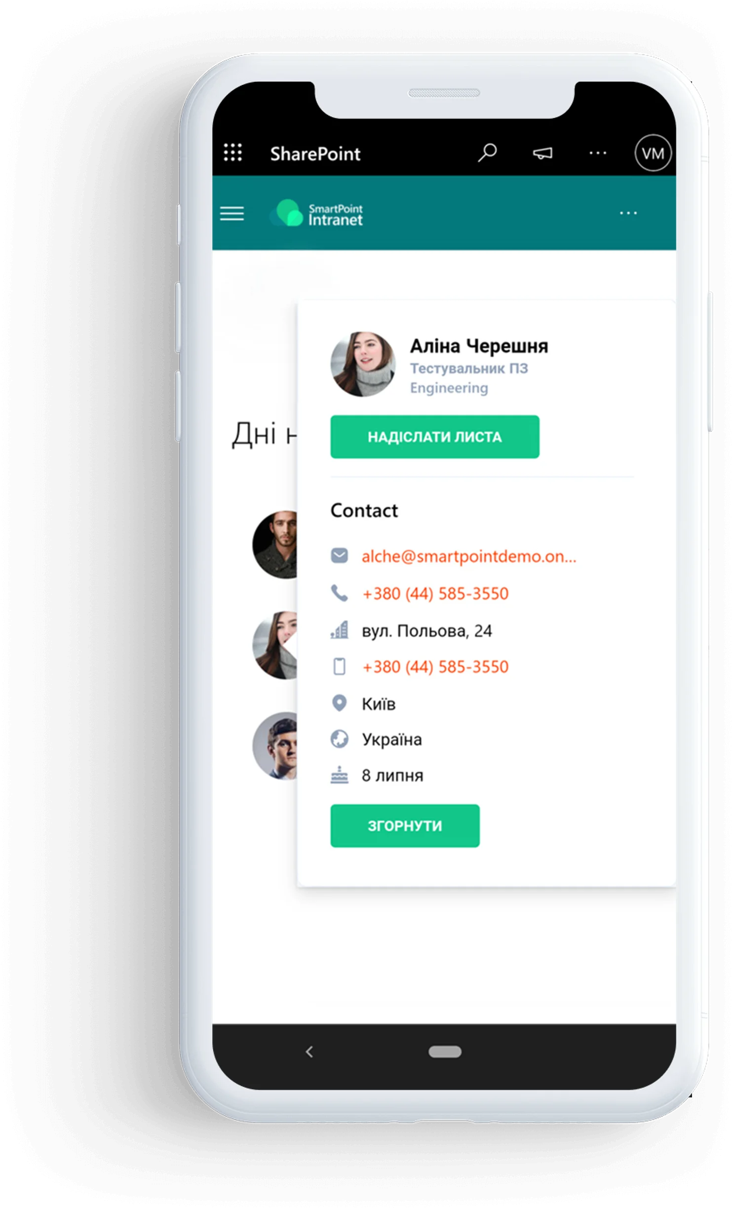 - ვუალა! ყველა თქვენი დოკუმენტი, კონტაქტი, დავალების სტატუსი და კორპორატიული პორტალის სხვა განყოფილებები ახლა თქვენს ტელეფონშია მოსახერხებელი ინტერფეისით.