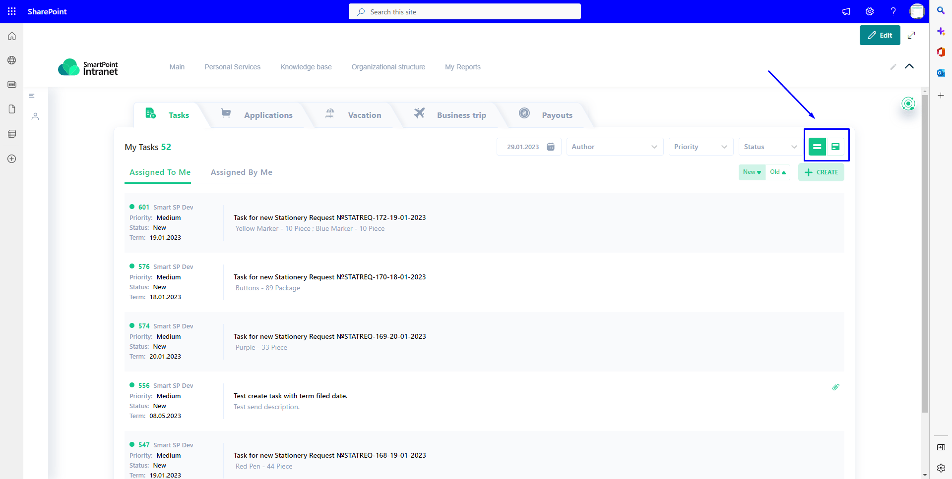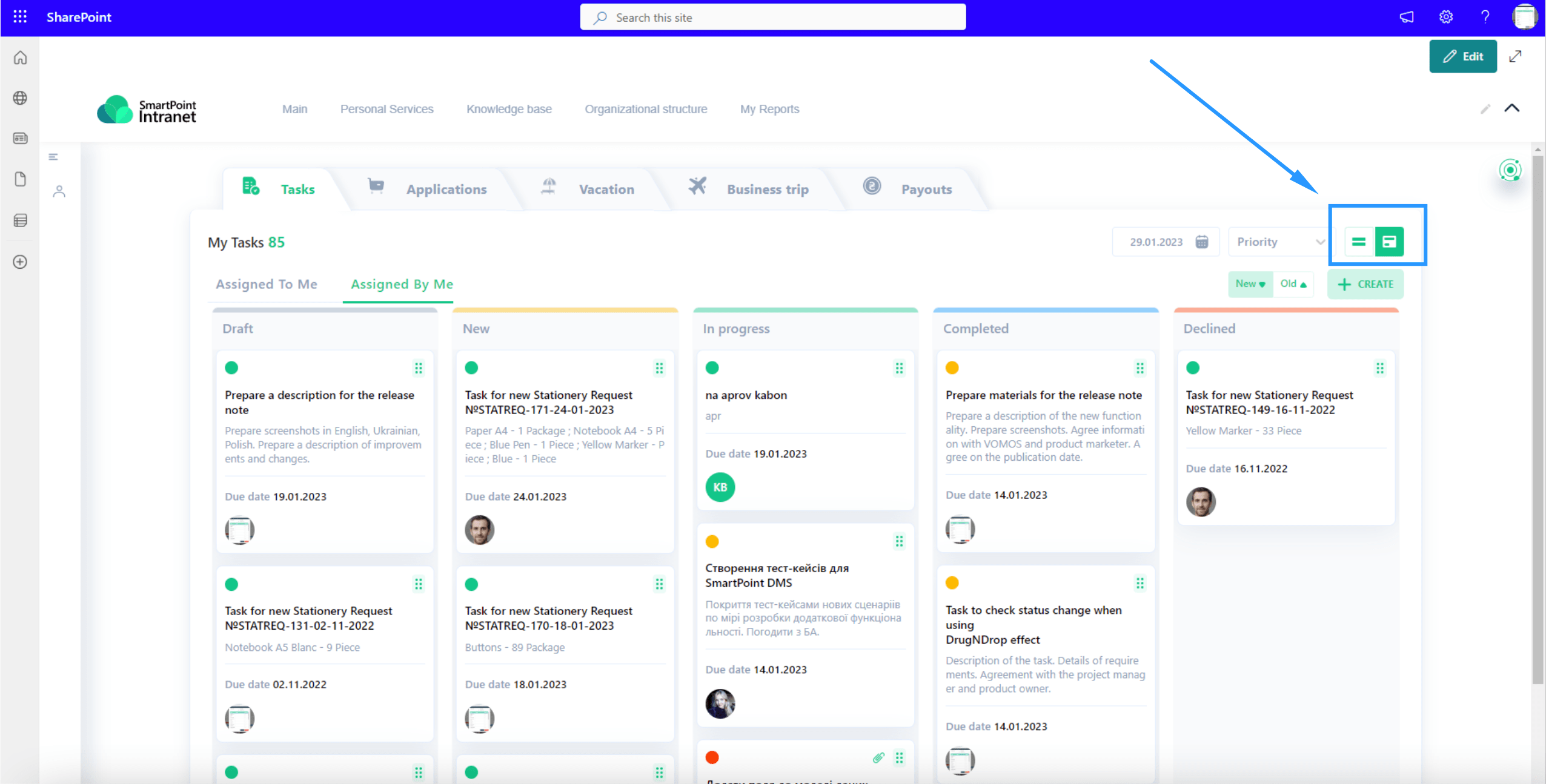 არაერთხელ გვსმენია ჩვენი მომხმარებლებისგან, რომ დავალების მართვის ბარათის ვიზუალი მეტად მოსახერხებელია და უკეთ უზრუნველყოფს ამოცანების შესრულების პროცესების სტრუქტურიზაციას, ის გვთავაზობს სისტემურ მიდგომას გუნდების ეფექტურობის გაუმჯობესების შესაძლებლობების იდენტიფიცირებისთვის. შესაბამისად, ამ რელიზში გადავწყვიტეთ Kanban-ის იმპლემენტაცია SmartPoint Intranet-ში.