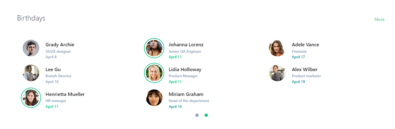 თანამშრომლის დაბადების დღეს დაემატა ფერის ადაპტაციის ფუნქცია. ახლა მოვლენების ქრონოლოგიაზე ნავიგაცია ბევრად უფრო ადვილია: ნაცრისფერი მიუთითებს წარსულ დაბადების დღეებზე, ღია მწვანე მიუთითებს დღეს აღნიშვნებზე, მუქი მწვანე მიუთითებს მომავალ დაბადების დღეებზე.
