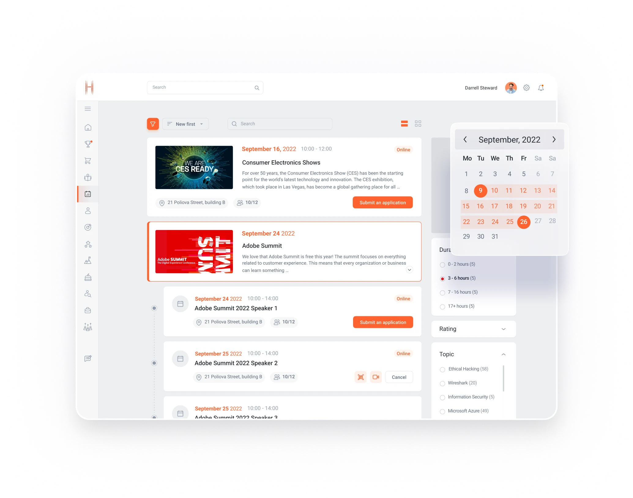 საჭირო ღონისძიებებზე სწრაფი წვდომისთვის შეგიძლიათ გამოიყენოთ ფილტრები და დაალაგოთ მოვლენები პერიოდის ან ინტერესების მიხედვით, იხილოთ მომავალი სესიები და მოიტხოვოთ მონაწილეობა