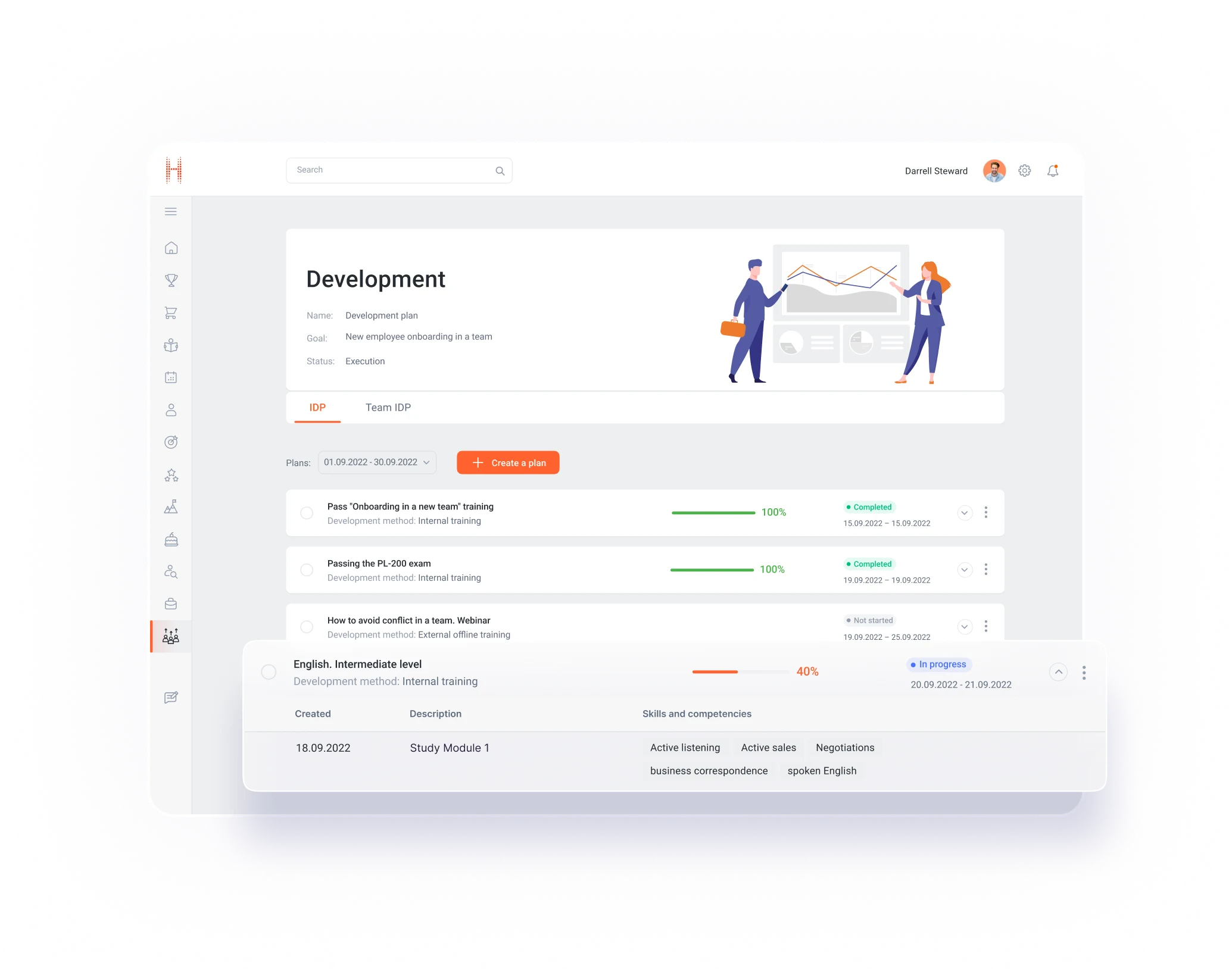 - განვითარების გეგმების შედგენა სხვადასხვა მიზნებისთვის: ახალი თანამშრომლის განვითარების ადაპტაცია Talent Pool პროექტის ფარგლებში, ახალ პოზიციაზე გადასვლა.