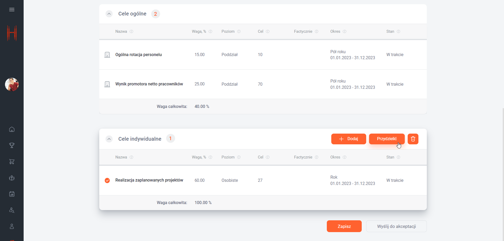 Ważne. Pracownik może dostosować priorytet w zależności od ilości dostępnych celów, ale nie może usunąć rozłożonego zapisu.