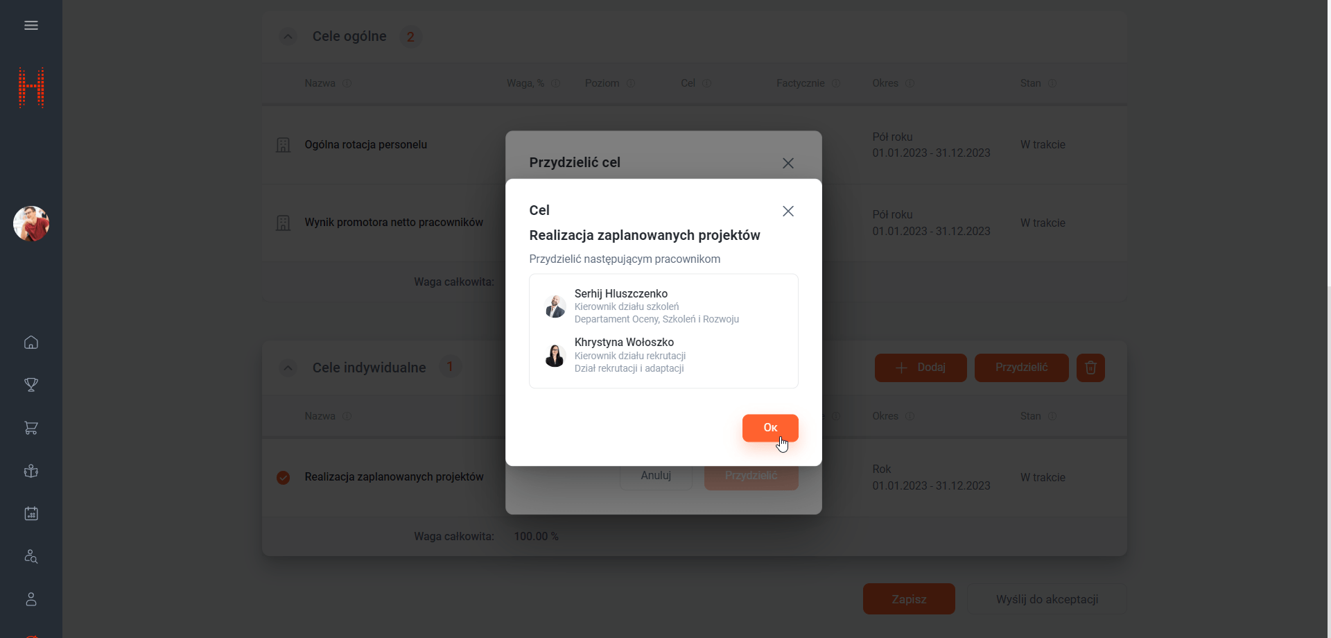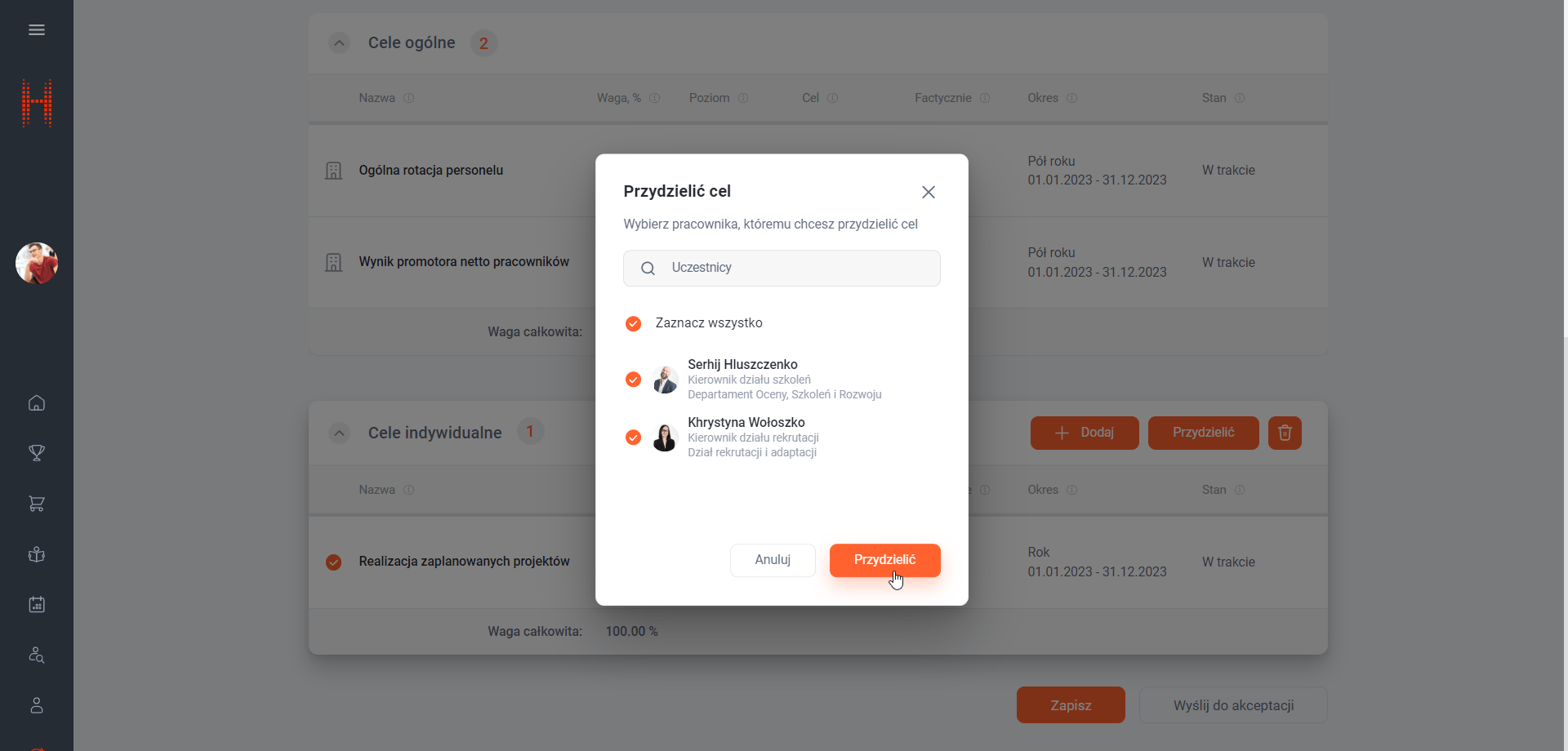 Krok 2. Wybierasz odpowiedzialnych pracowników i przypisujesz im cel indywidualny. Oznacza to, że Twój cel jest teraz dodany do listy celów wybranych pracowników. System sprawdzi, czy nie został utworzony duplikat.