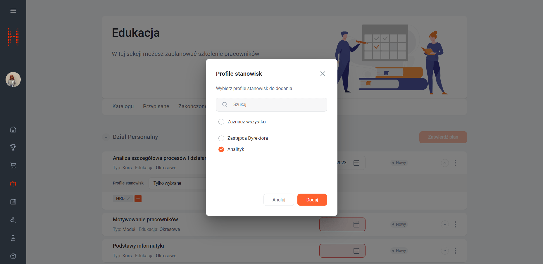 Za pomocą sekcji «Profile stanowisk» możesz zaplanować szkolenia rozwijające określone umiejętności i kompetencje, które odpowiadają profilom stanowisk.