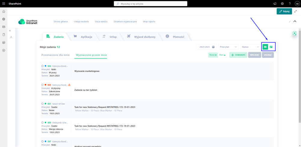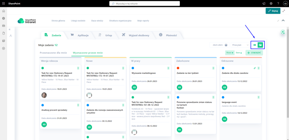 Wielokrotnie słyszeliśmy od naszych klientów, że widok karty zarządzania zadaniami jest bardziej atrakcyjny wizualnie i lepiej strukturyzuje procesy realizacji zadań, czyli oferuje bardziej systematyczne podejście do identyfikacji możliwości poprawy wydajności zespołu. Dlatego w tym wydaniu postanowiliśmy wdrożyć kanban w SmartPoint Intranet.