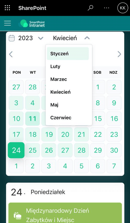 Kalendarze firmowe i osobiste w wersji mobilnej i tabletowej zostały przeprojektowane: lista miesięcy i lat jest teraz wyświetlana jako lista rozwijana.