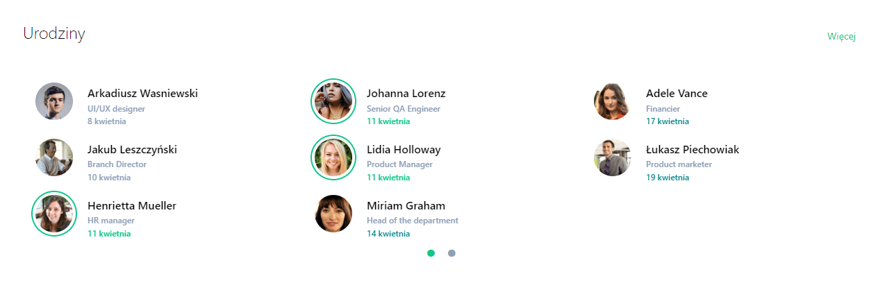 Dodano dostosowanie kolorystyczne do daty urodzin pracownika. Znacznie ułatwia to nawigacje po chronologii wydarzeń: kolor szary oznacza przeszłe urodziny, jasnozielony – te obchodzone dzisiaj, ciemnozielony – nadchodzące urodziny.