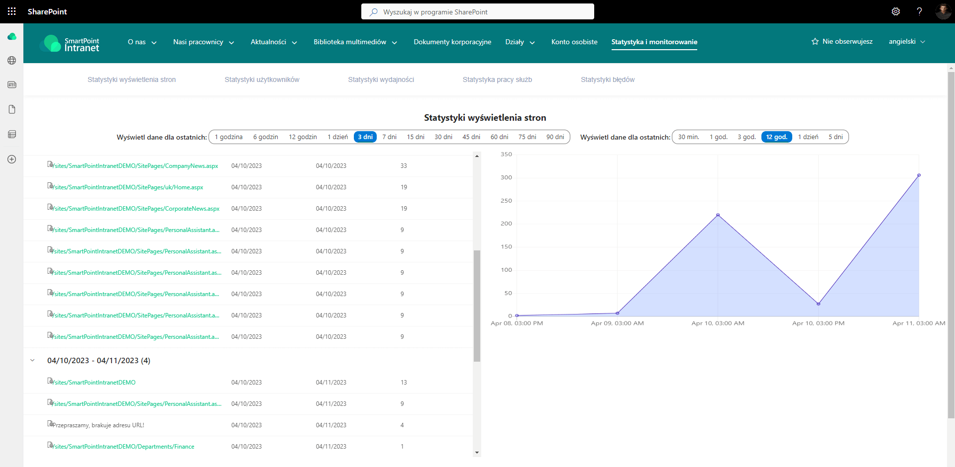 Zaktualizowano widok bloku Statystyka i monitorowanie, aby ułatwić przeglądanie informacji (bloki tekstowe, wykresy, diagramy). Zwiększono wysokość bloku w celu wygodnego i łatwego przetwarzania danych przez administratora portalu, w szczególności podczas pracy z danymi na dużych ekranach panoramicznych.