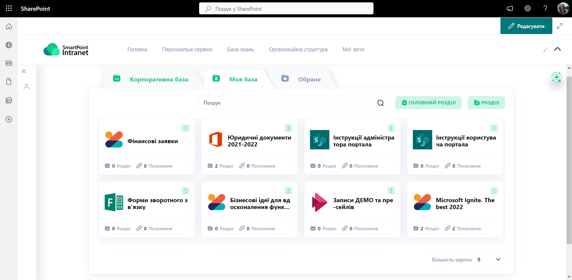По-перше, ми розширили значення корпоративної Бази знань порталу, додавши можливість користувачам створювати власний центр компетенцій. Тепер кожен співробітник може завантажувати необхідні йому матеріали до окремого розділу.