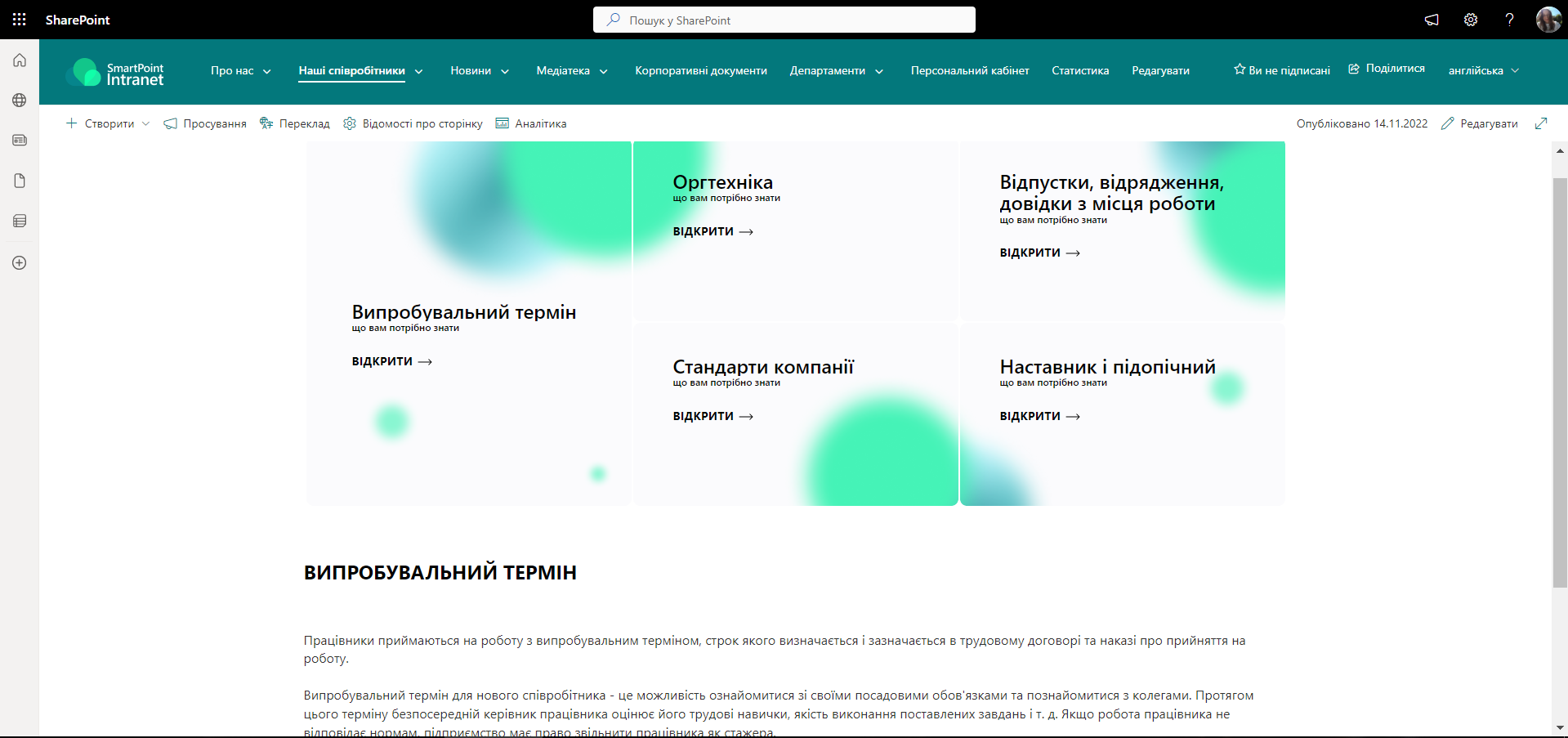На головний екран розділу можна вивести теми, які найбільше турбують ваших співробітників. Наприклад, інформацію про відпустки або як отримати довідку з місця роботи, а також про корпоративні сервіси, такі як відвідування кафе, спортзалу та оздоровчого кабінету.