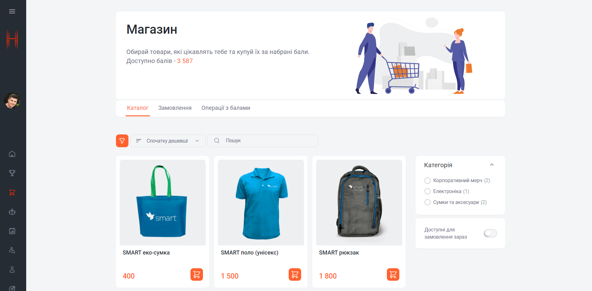 Для замовлення будь-якого товару з магазину співробітник повинен бути активним учасником програми гейміфікації й отримувати бейджі за свої досягнення, на основі яких відбувається автоматичне нарахування балів.