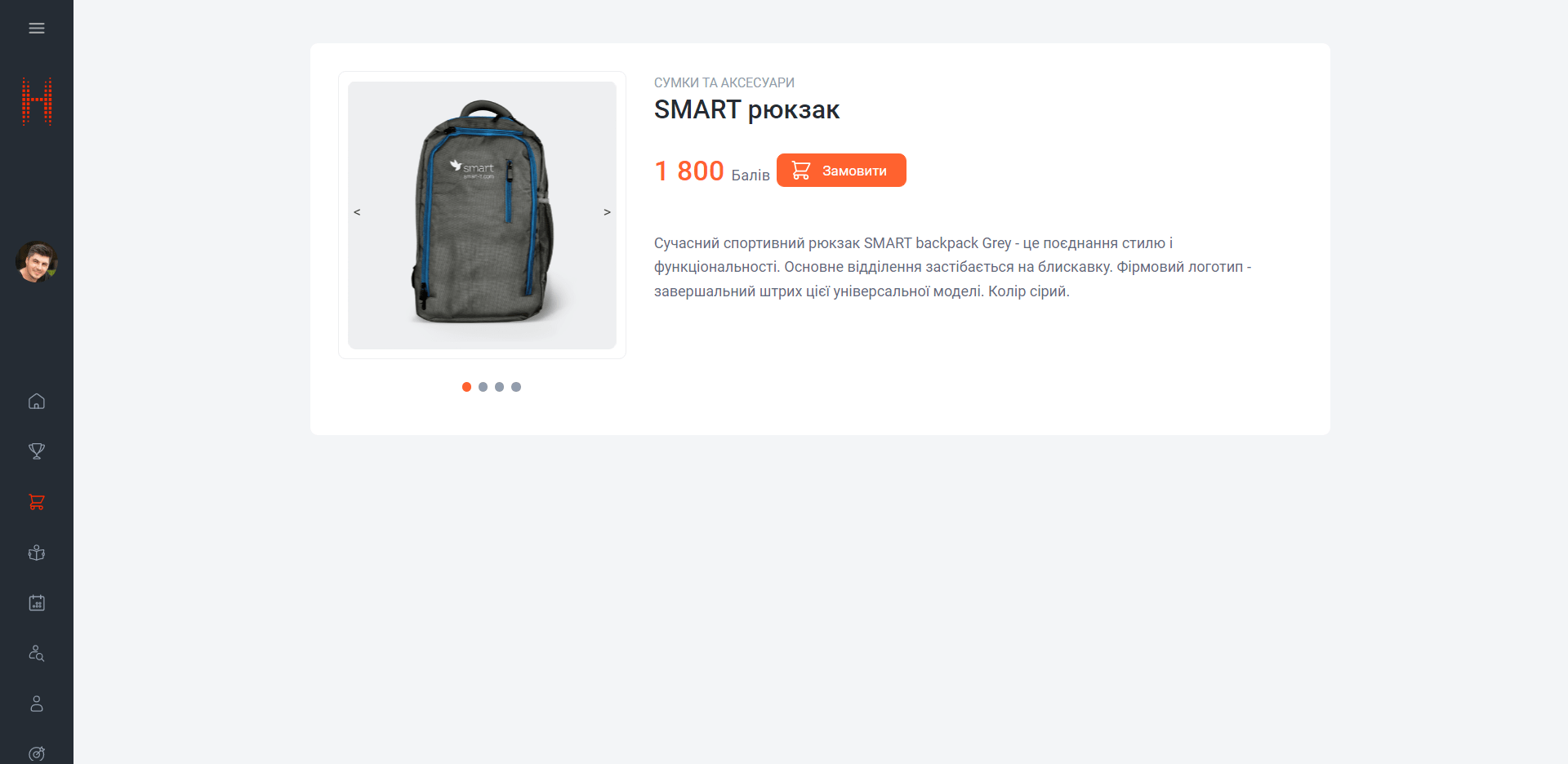- сторінку для співробітника, де він може переглянути всі доступні йому товари, статус замовлень, ознайомитися з історією нарахування та списання балів з рахунку, переглянути баланс балів на поточну дату;