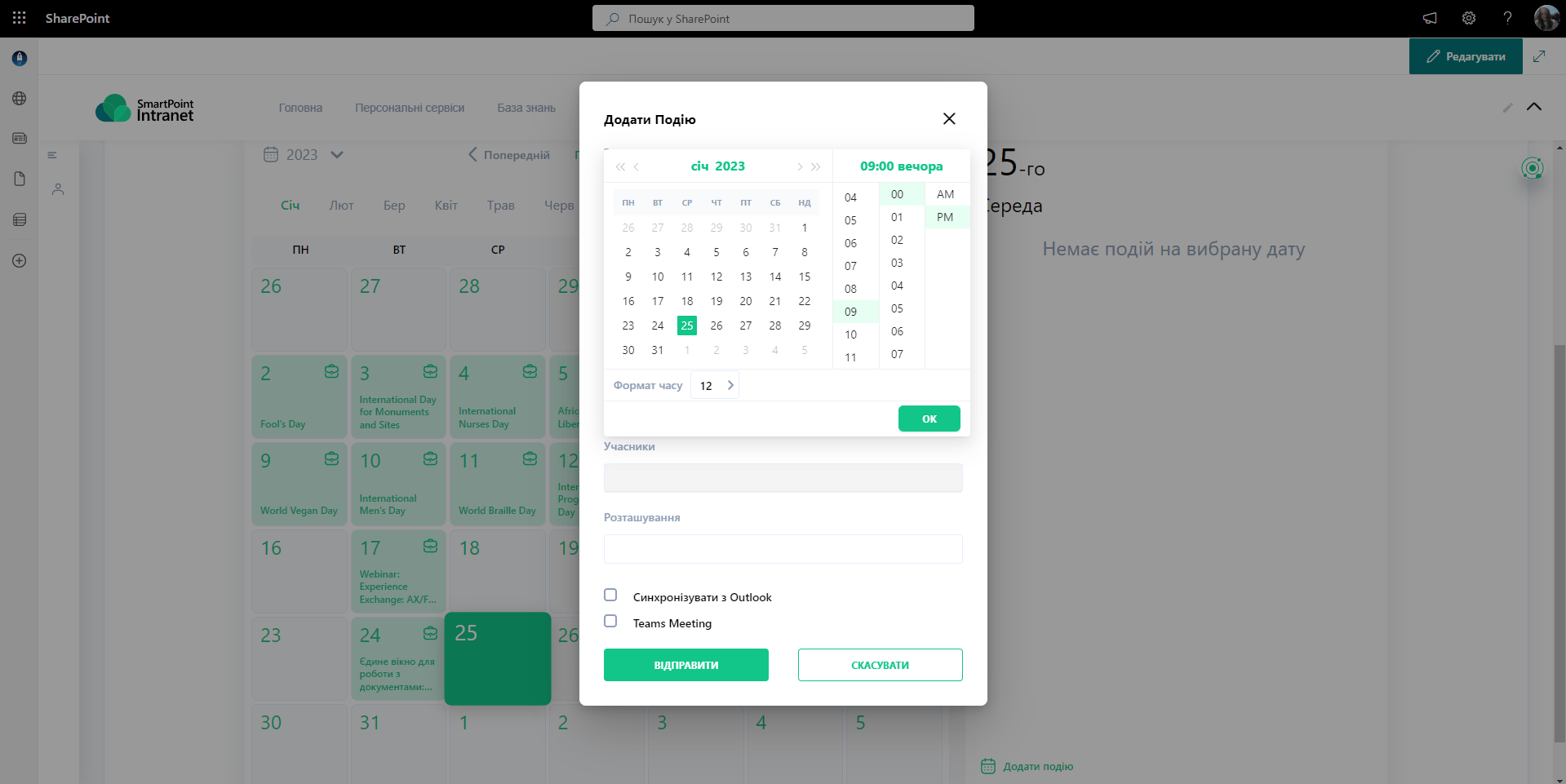 Наприклад, вам необхідно створити робочу зустріч. Відкрийте на порталі форму створення зустрічі з мобільного чи ПК, натисніть на поле з календарем. Оберіть потрібний формат часу (AM чи PM). Підтвердіть внесені зміни.