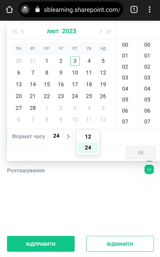 Саме тому ми вирішили замінити стару версію дейтпікера на усіх формах порталу на сучаснішу та зручнішу, щоб покращити досвід використання у десктопній, планшетній та мобільній версіях. Також це дає можливість користувачу обирати, який формат часу для нього є зручнішим – 12-годинний чи 24-годинний.