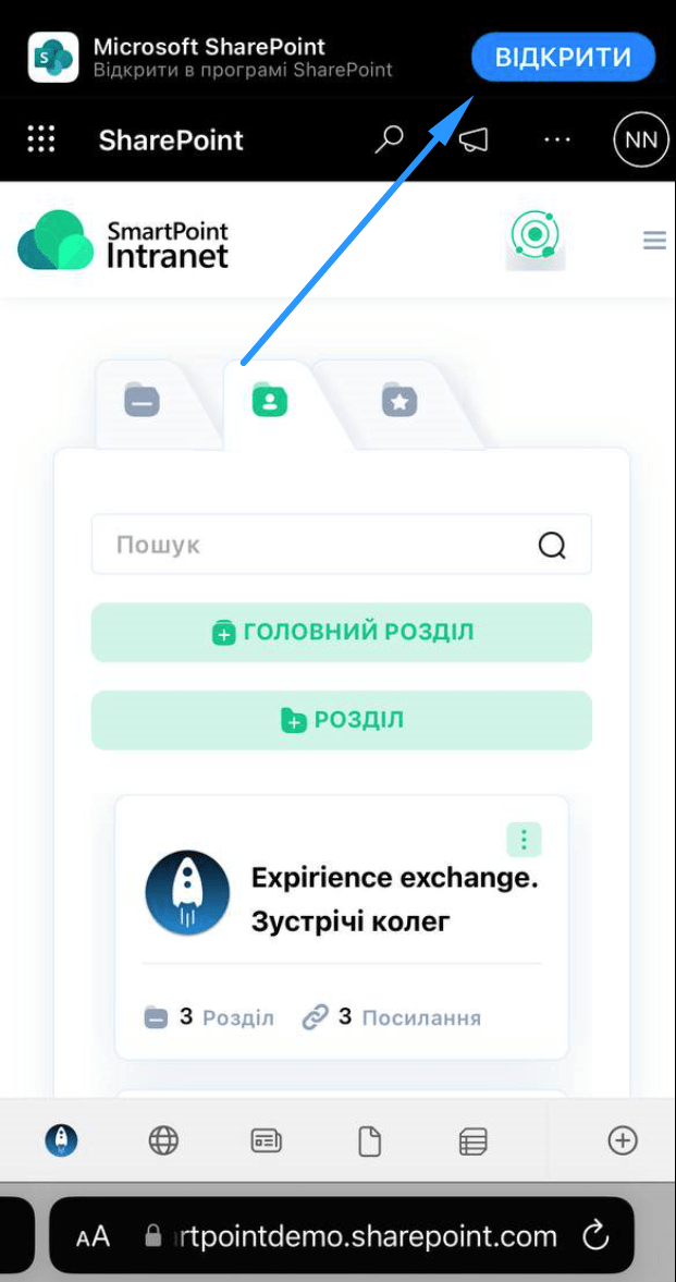 До речі: ми демонструємо візуальне представлення у мобільному з браузера, але всі користувачі SmartPoint Intranet також можуть завантажити додаток Microsoft SharePoint і користуватися всім функціоналом порталу через нього. Про це детальніше розповіли тут.
