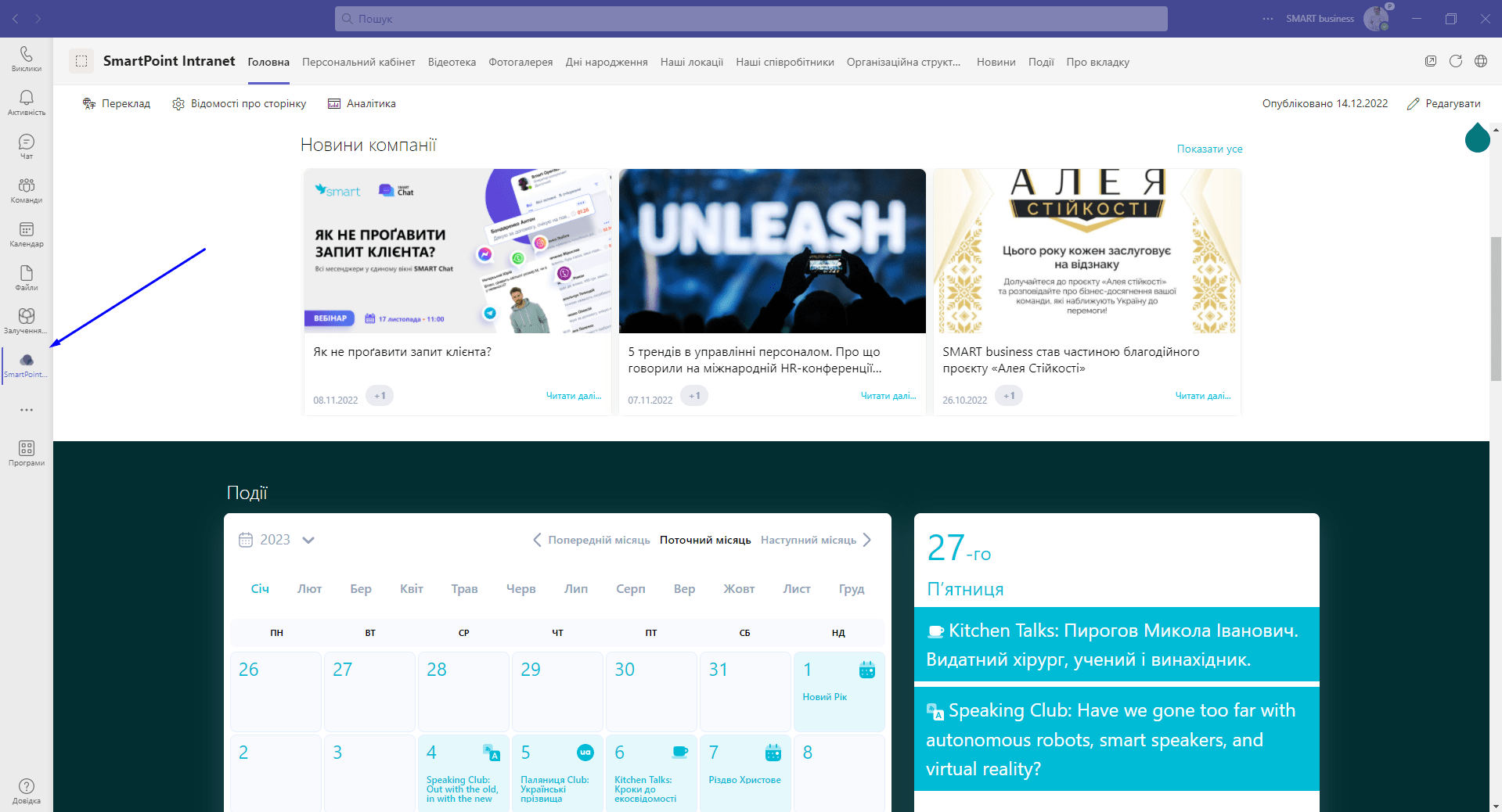 Просто відкрийте свій Microsoft Teams у класичній версії та додайте портал в робочій панелі за таким шляхом: Каталог програм – SmartPoint Intranet – Перейти.