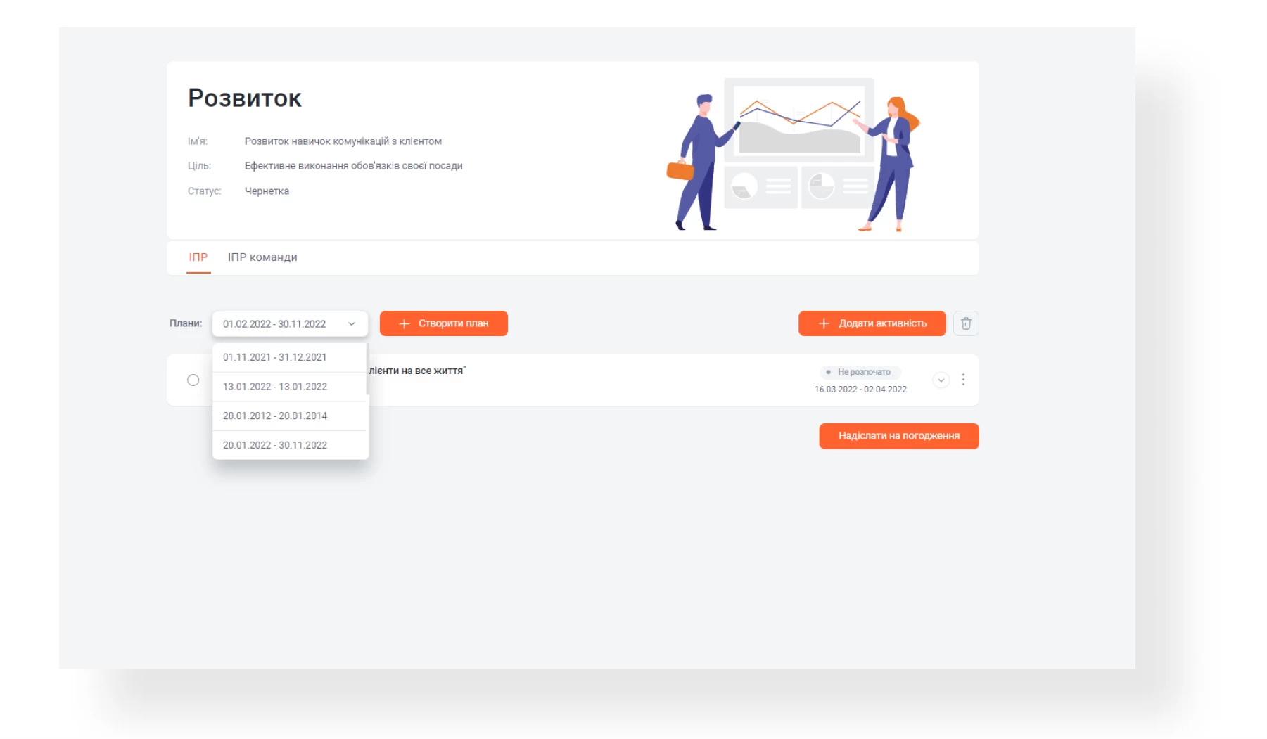 Співробітник заходить на платформі в розділ «Розвиток» та натискає кнопку «Створити план».