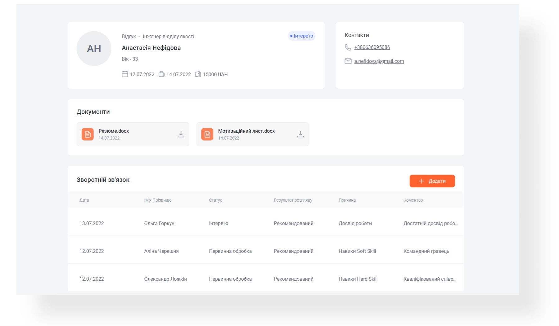 Під час заповнення форми кандидатом в системі буде створено його профайл, додано відгук на відповідну вакансію та збережено всі додані файли.