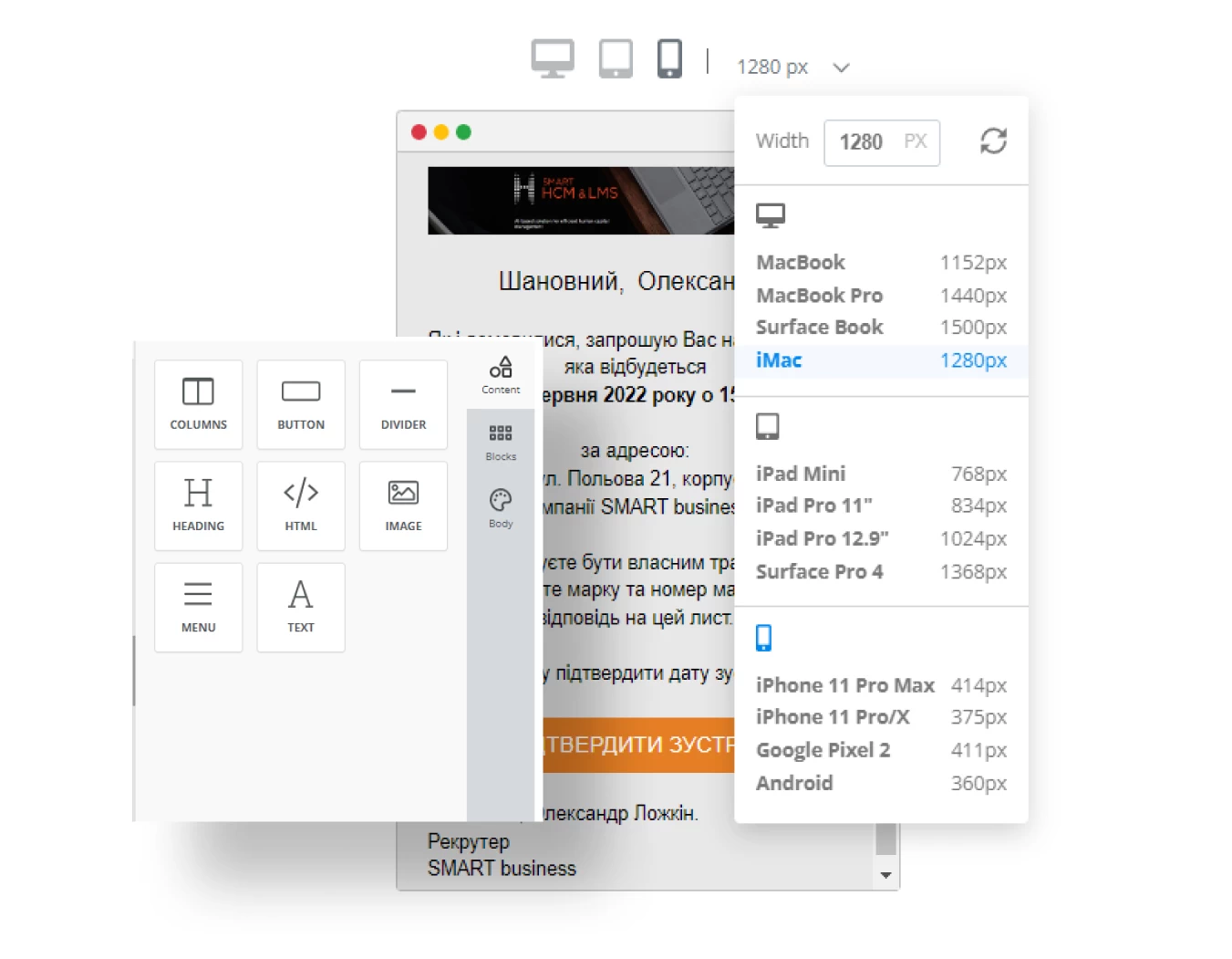 Користувачу не потрібно використовувати сторонні HTML-редактори, адже необхідні інструменти редагування налаштовані вже в системі. Оновлений редактор створює професійні листи на основі блоків контенту та має можливість попереднього перегляду листа в режимі відображення монітору ПК та екранів мобільних пристроїв для кращої адаптації контенту.
