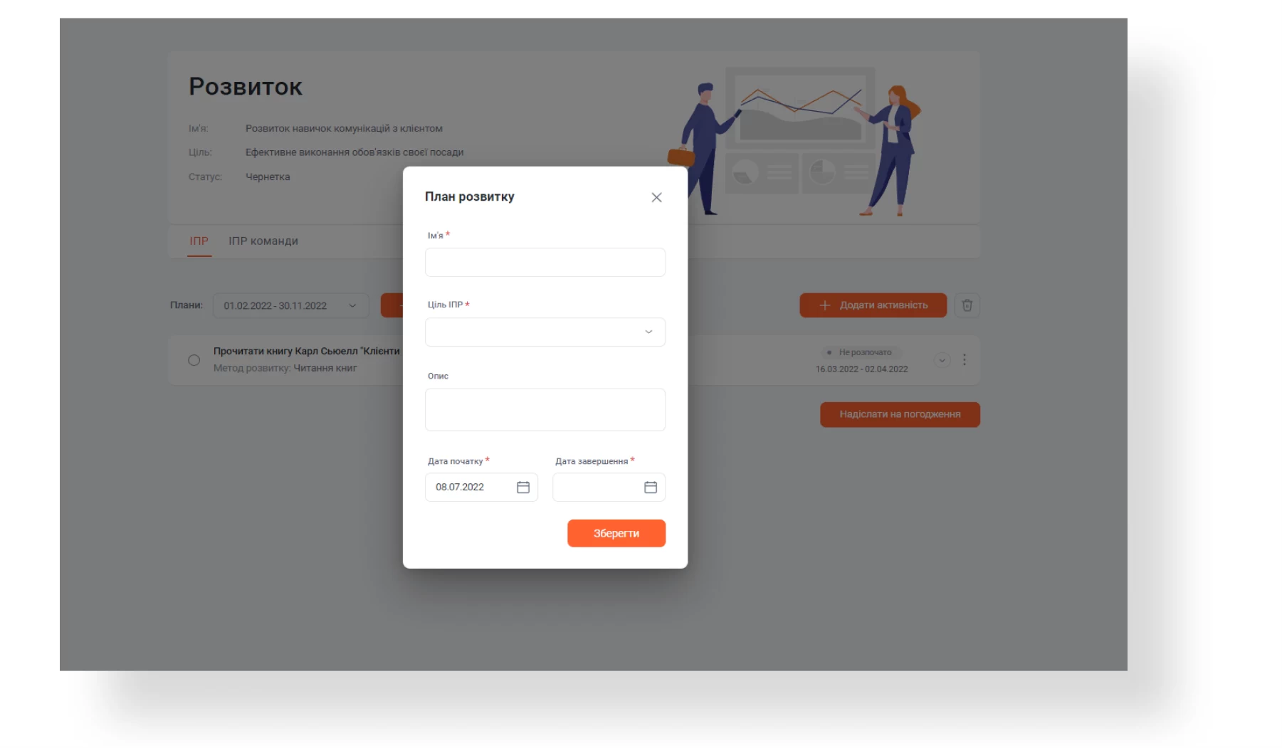 Вказує назву ІПР, мету, заплановані дати початку та завершення ІПР, а також деталізує свій план в полі «Опис».