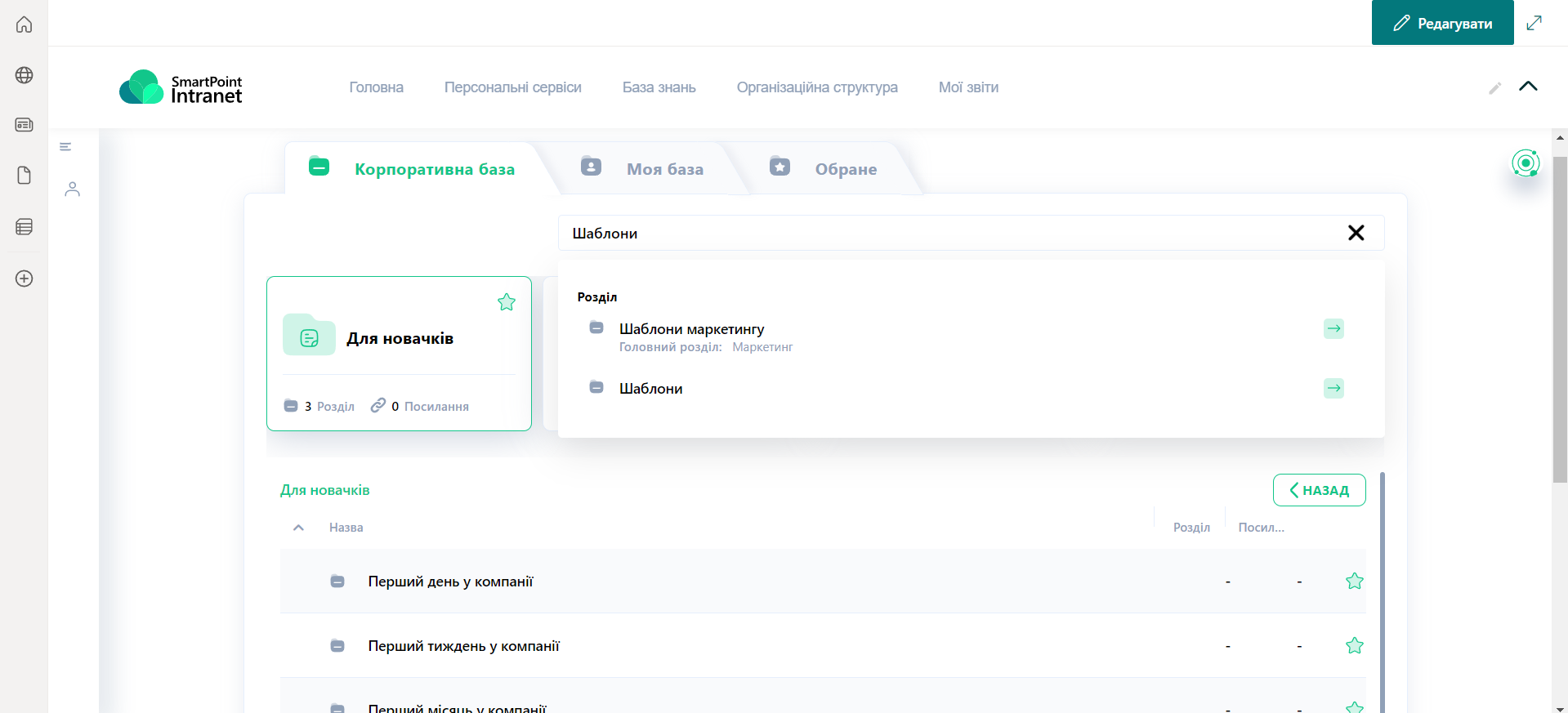 - швидко знаходити контакти колег та необхідну інформацію в Базі знань,