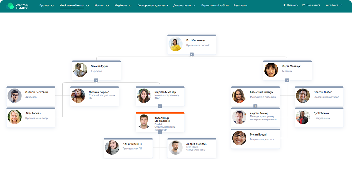 Актуально для великих компаній: ваші співробітники фізично не можуть запам’ятати, до якого департаменту відноситься кожен їхній колега, а тим паче кому він підпорядковується. Для цього існує розділ «Організаційна структура», який розв’язує таку проблему.